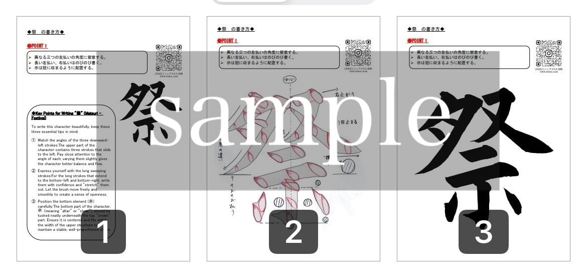 解説、なぞり用手本、黒手本のさ3枚セットになります。